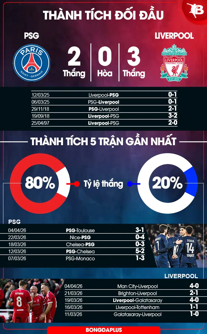 Cuộc chạm trán giữa PSG và Liverpool luôn là màn đối đầu hấp dẫn với lịch sử cân bằng. Sau 6 lần gặp nhau, mỗi bên đều có 3 chiến thắng và 3 thất bại. Trận tứ kết lượt đi tại Parc des Princes sắp tới hứa hẹn sẽ là chương mới đầy kịch tính trong cuộc đua giành vé vào bán kết.