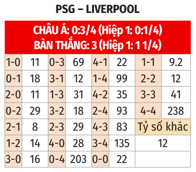 - PSG ghi bàn hiệp 1: Khả năng ghi bàn sớm của PSG rất cao khi họ làm được điều này trong 7/9 trận gần đây và 10/13 trận sân nhà. Đây là điểm yếu của Liverpool khi họ để thủng lưới ở hiệp 1 trong cả 3 trận làm khách vừa qua.