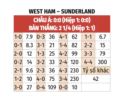 - Bàn thắng sớm: 15/20 trận gần đây của West Ham chứng kiến ít nhất một bàn thắng trong hiệp 1. Xu hướng này cũng xuất hiện ở 4/5 trận gần nhất của Sunderland.